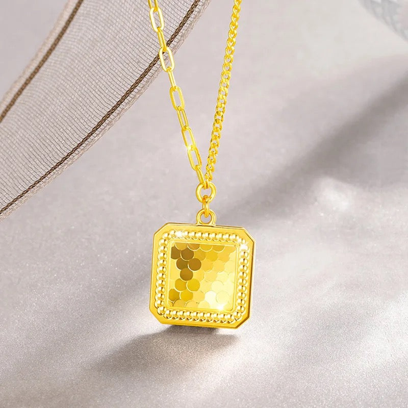 Elevate your style with the Serenity Pendant Necklace. This elegant piece features a gold pendant with a distinctive square shape and embossed figure, adding a touch of sophistication. The pendant is gracefully suspended from a link chain, secured with a lobster clasp for a comfortable fit. The polished finish enhances its luxurious appeal, making the Serenity Pendant Necklace a perfect accessory for any occasion.